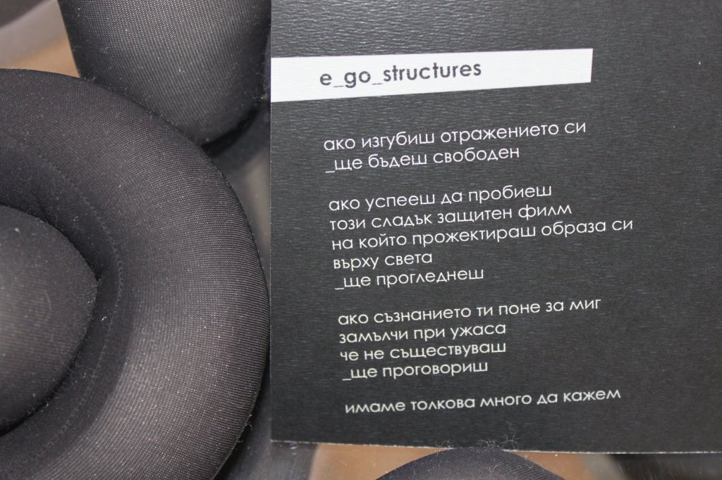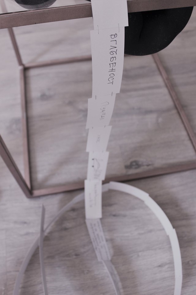 _влизайки, Десислава подава на всеки сиво картонено блокче – подобно тъкан, върху която гостите ще разположат свой знак, разпознавайки го в прочита си на това, което усещат вътре.