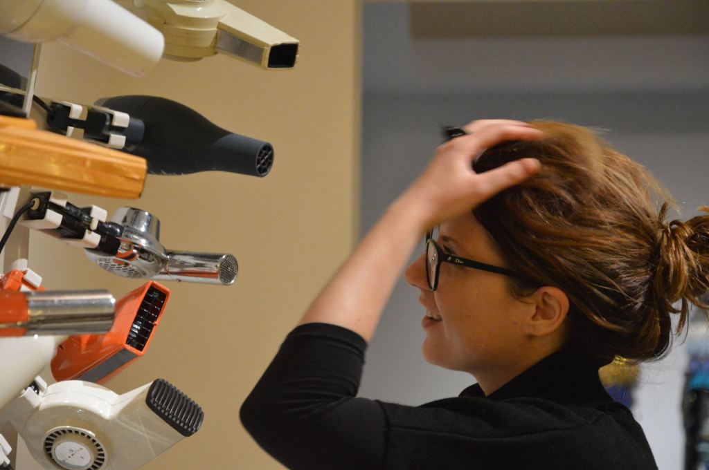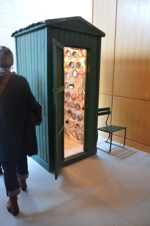 писоар, грижовно обвит в цветя, изплетени ръчно на една кука в многоцветния баланс от безгрижието на демагога. огледало, дебнещо образа на виждащия себе си, с множество сешоари около него, работещи едновременно до степен – загубване в посоката на изсушаване, разколебаване на действителността като намерение и цел.