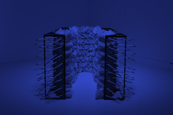 сърце от пластмасови вилици, танцуващо нежно при ироничното движение на въздуха, задвижен от кристалната мисъл на преминаващите наоколо_в стая с черни стени.