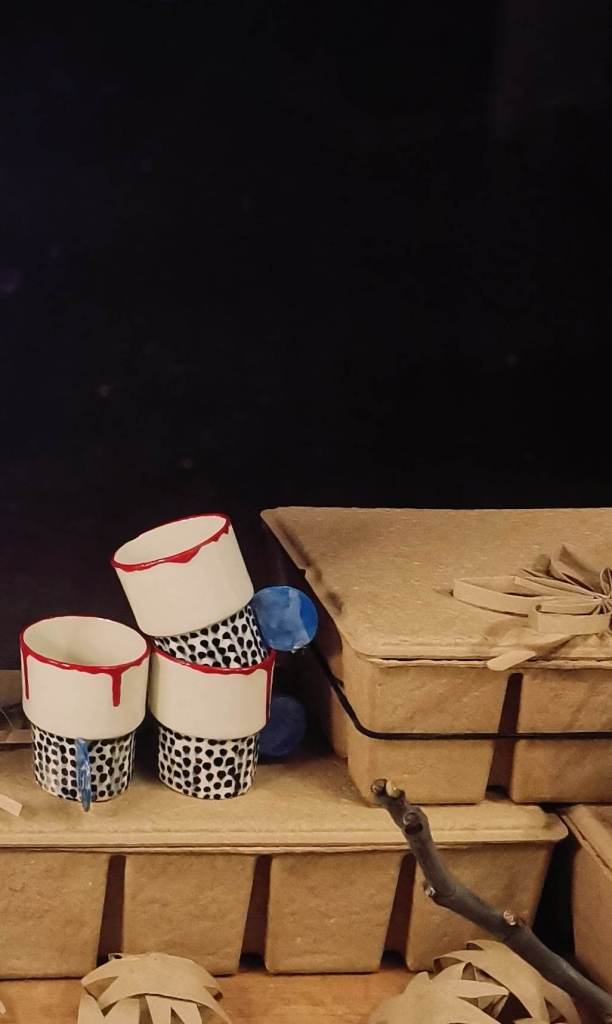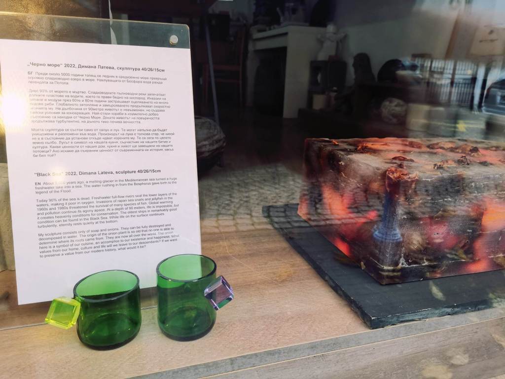 така например пластичната работа на Димана Латева ‘ Черно море ‘, изградена от сапун и лук, показана за публика само месец преди това, експонирахме в общо семантично звено с чашите от стъкло на Елизар Милев, при които вътрешната динамика е в съчетанието – дизайн мотив и геометрия, свързани с тялото на една бутилка.