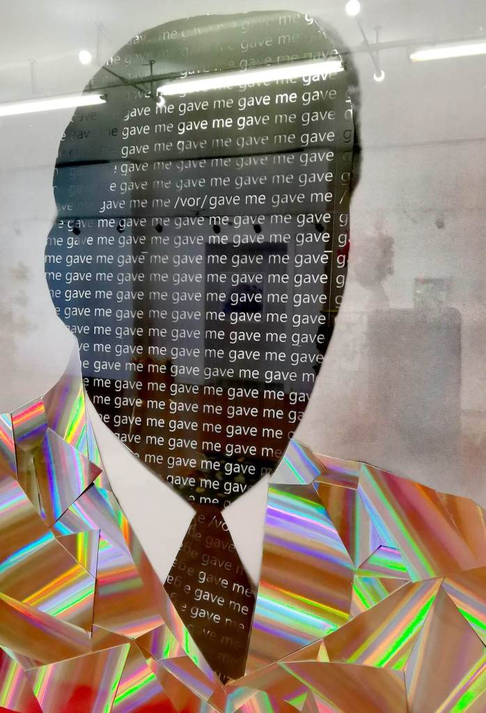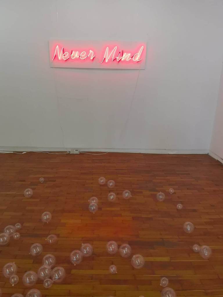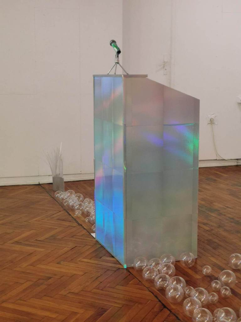 _Моите обекти „имитираха“ и повтаряха по естествен начин предметите, които са се намирали в пространството, когато то е било зала на градският комитет на партията. Катедра беше облепена в холографски материал, който сменя представата за обекта спрямо светлината. Това е начин всеки да припознае правото на своя позиция, цвят на своя политическа идея. Диагонално на стената в дъното имаше светлинен надпис „never mind”. Според мен маркира нихилизма, че не сме способни да влияем на процеси, които са заложени в развитието на човешкото общество, процеси, чиито закономерности не виждаме. Изборът на холографския материал е основна част от проекта. Ефект, използван при банкнотите и други официални документи.