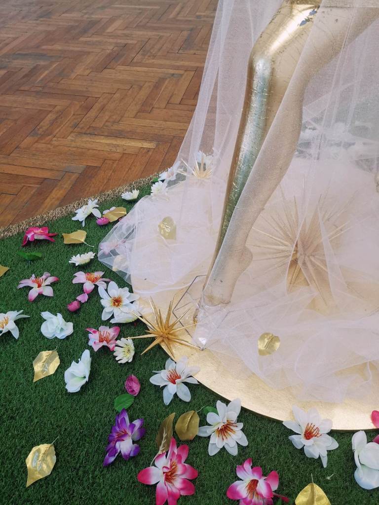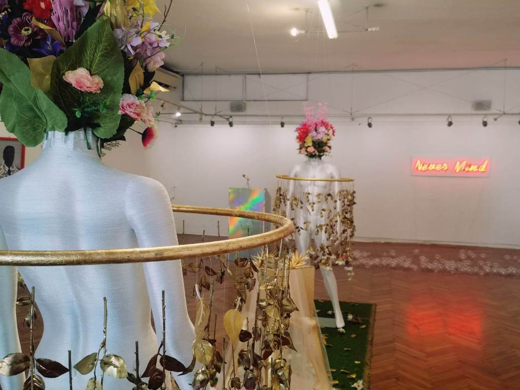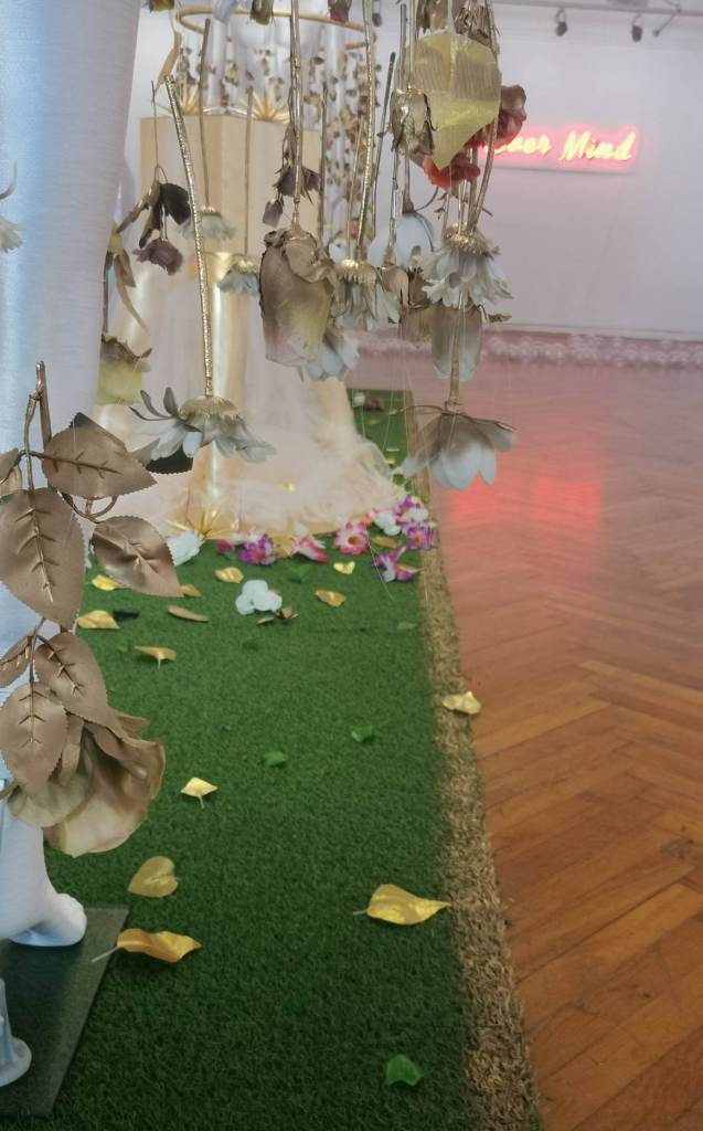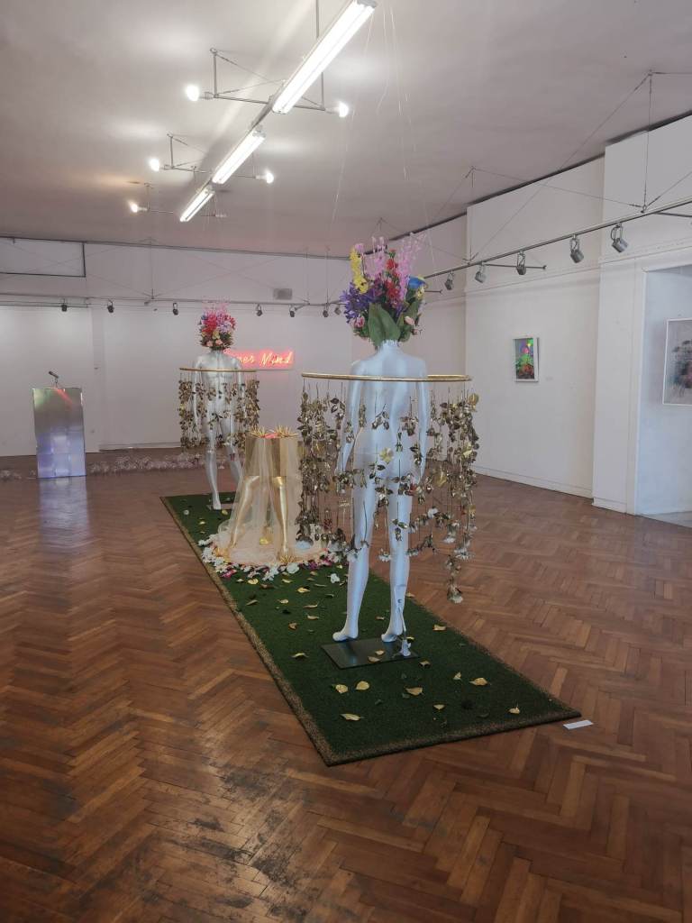 _Моята инсталация, която имитира Райската градина е разположена в центъра на залата, което е естествен композиционен фокус на пространството, но и смислов, защото преди политическата реалност е била религиозната, а и във всеки от нас е заложена идеята за онзи първи момент на осъзнатост и грях и всички последвали събития за човечеството. Не е случаен избора на манекени за Адам и Ева и главите, които са заменени от изкуствени цветя.