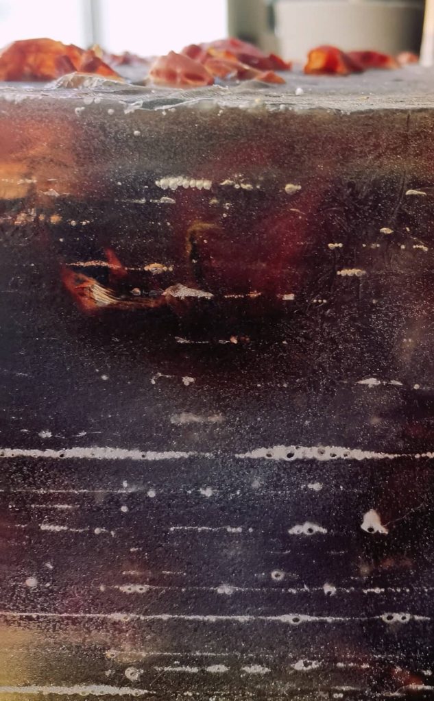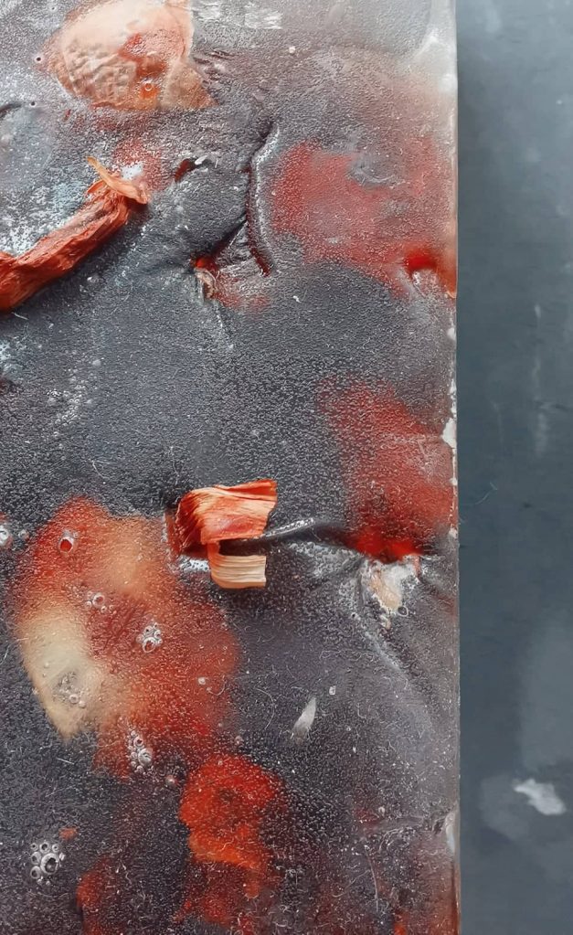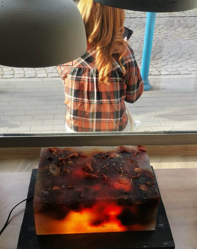 с определен творчески интерес, лично направени проучвания, подредила своите наблюдения до тези на съвременните учени, Димана Латева ме среща със своя пластичен обект_скулптурата Черно море, създадена от сапун и лук.