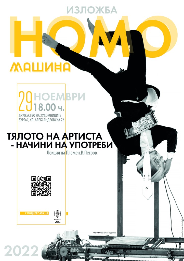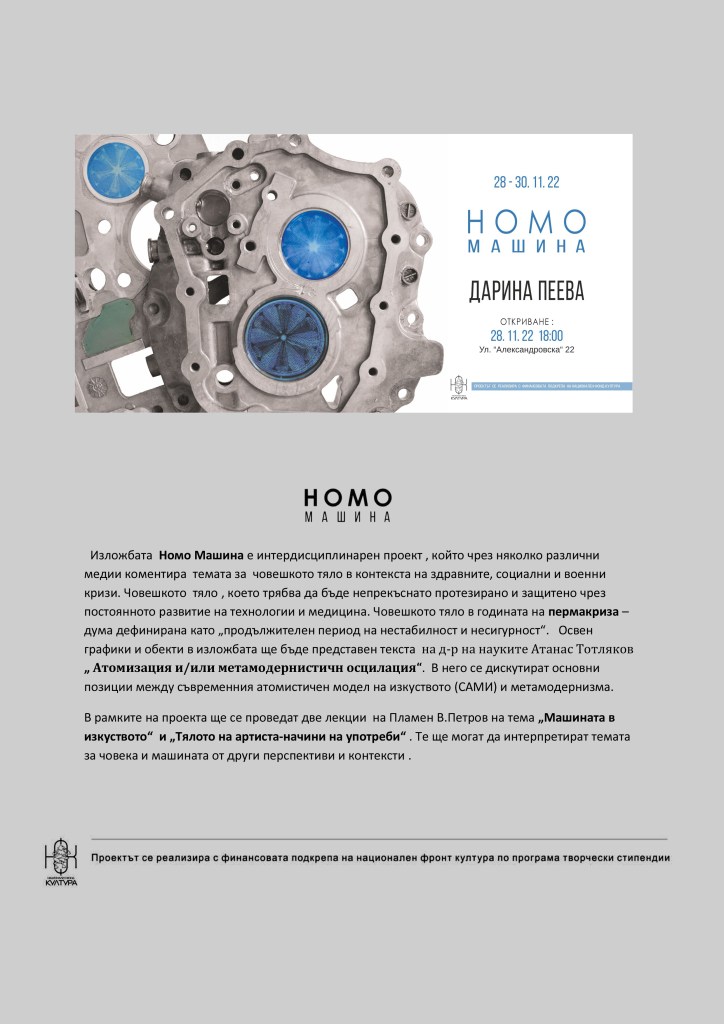 ‘ Изложбата Hомо Машина е интердисциплинарен проект , който чрез няколко различни медии коментира темата за човешкото тяло в контекста на здравните, социални и военни кризи. Човешкото тяло, което трябва да бъде непрекъснато протезирано и защитено чрез постоянното развитие на технологии и медицина. Човешкото тяло в годината на пермакриза –дума дефинирана като „продължителен период на нестабилност и несигурност“. Освен графики и обекти в изложбата ще бъде представен текста на д-р на науките Атанас Тотляков „ Атомизация и/или метамодернистичн осцилация“. В него се дискутират основни позиции между съвременния атомистичен модел на изкуството (САМИ) и метамодернизма.
