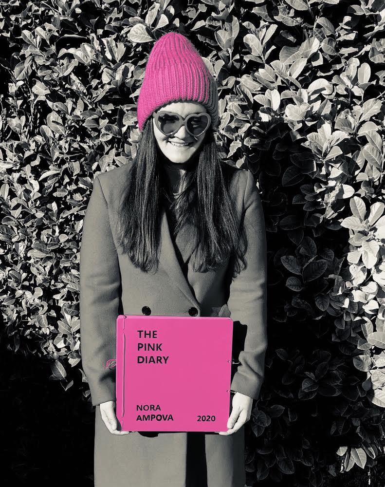 на снимката_Нора Ампова с творбата си “Розовият дневник” / дневник с 20 рисунки и колажи, които съдържат послания за светлите моменти от бита