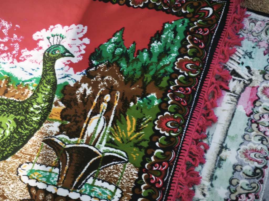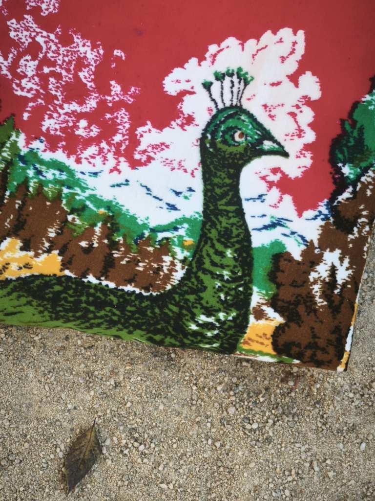 абзац 2 съдържа_ ковьор от края на 20 век, изобразяващ паун в градина с фонтан и арка / в преобладаващо ярки цветове / камък_естествена скална маса / парче огледало с надпис в черно_колко струва камъкът ти, Сизифе?
