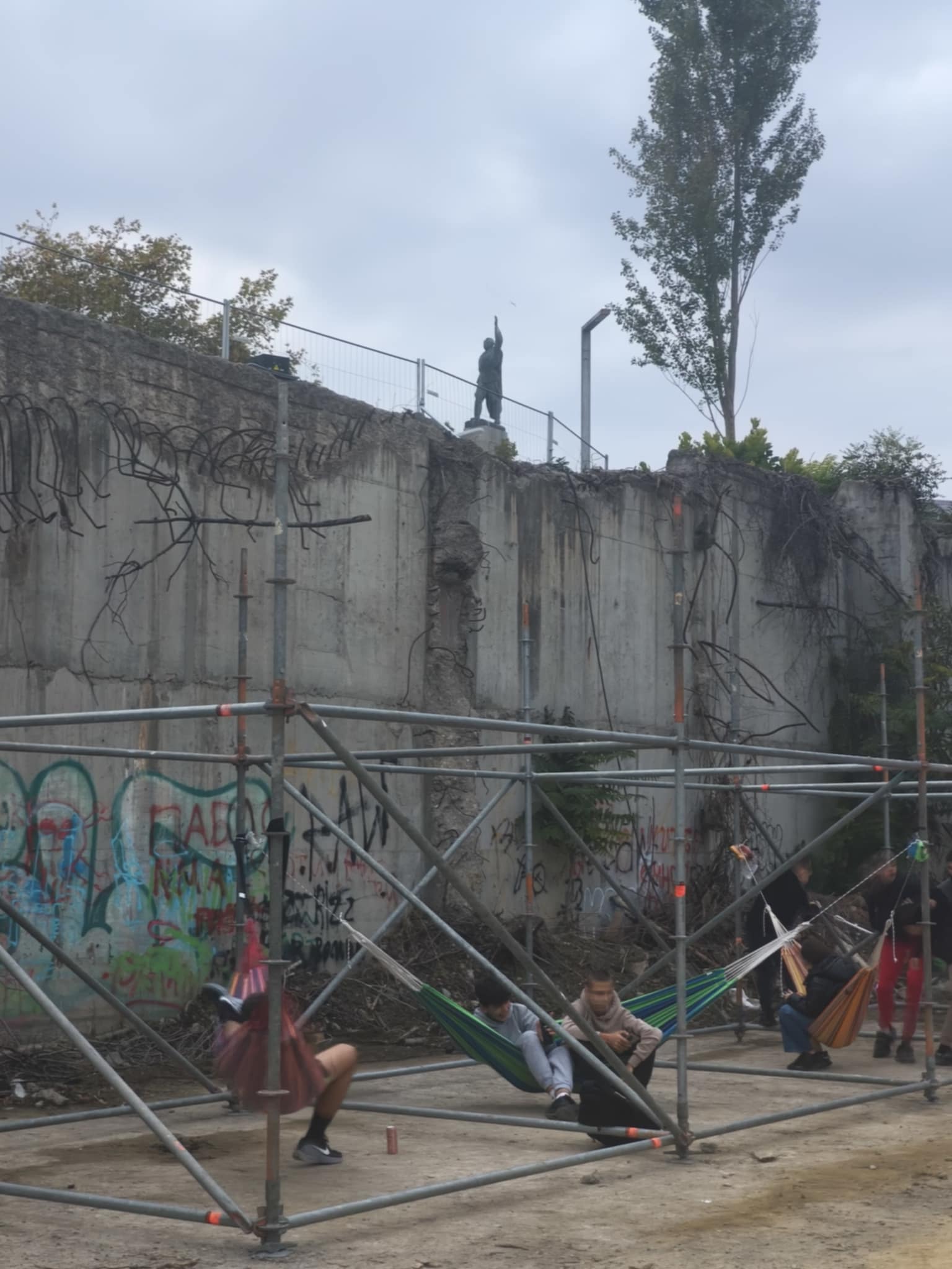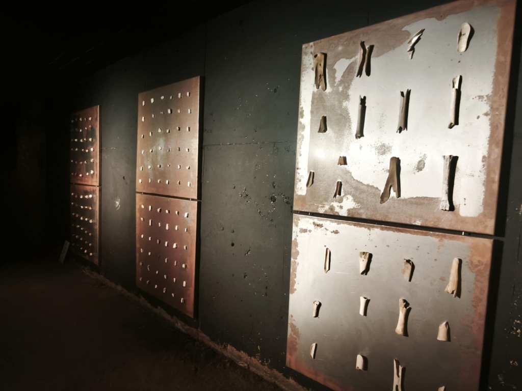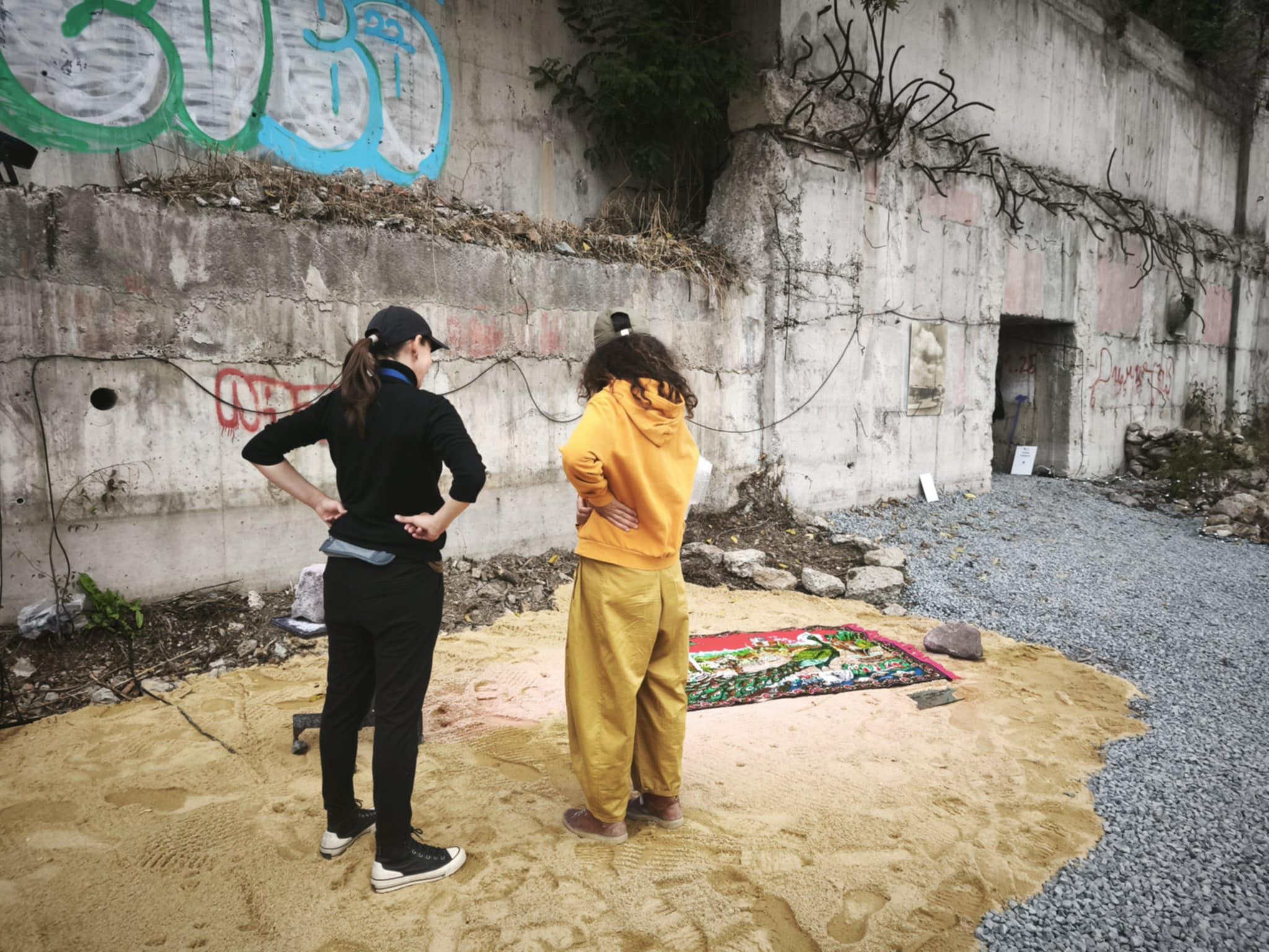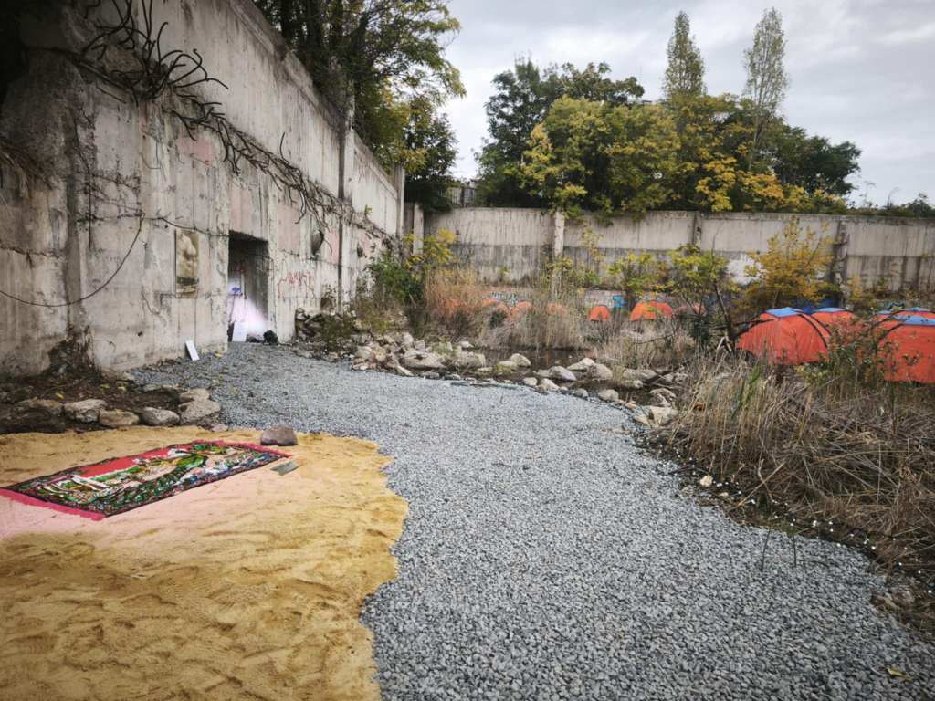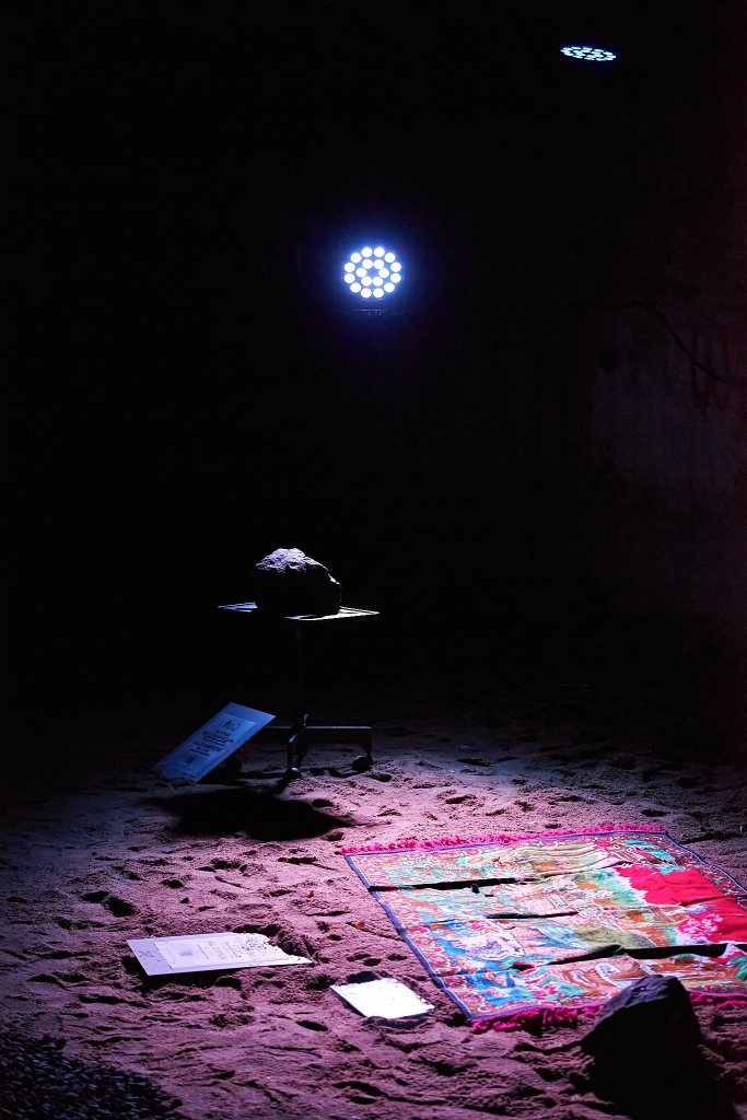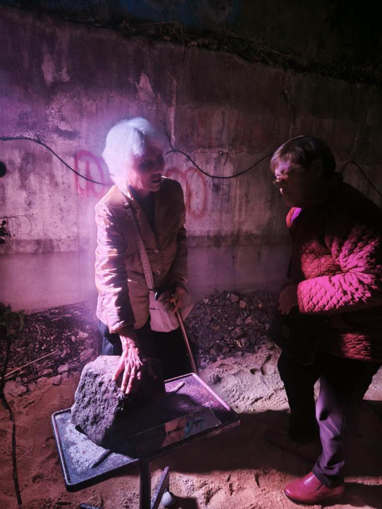 [нещо много важно, както за наратива, така и за прочита на инсталацията – двата камъка, които използвах са от Дупката, т.е. те са част от дългия зимен сън зад оградите, живи свидетели на 40-годишния капан на невъзможното общуване и най-вероятно са част от подземието на съборените градски къщи тогава – два камъка от близката история на Бургас]