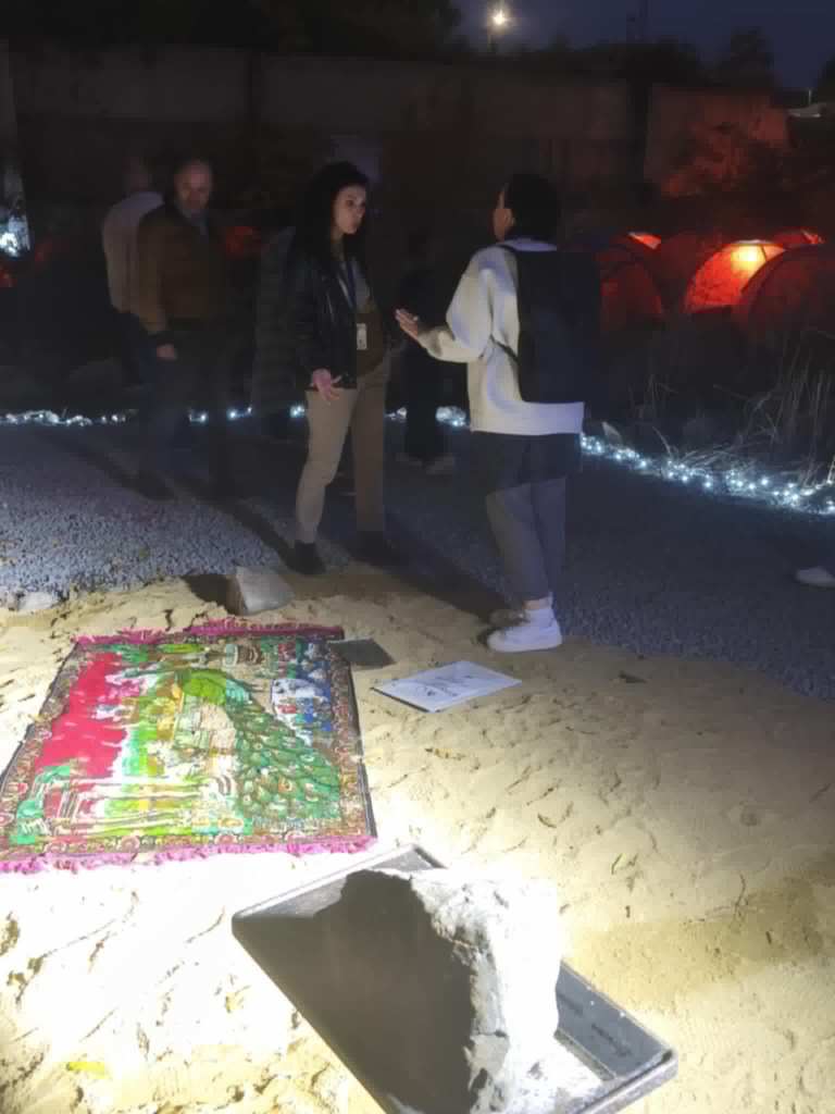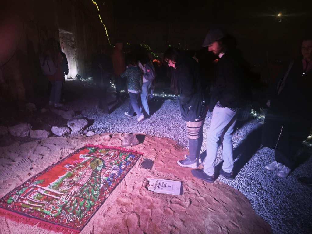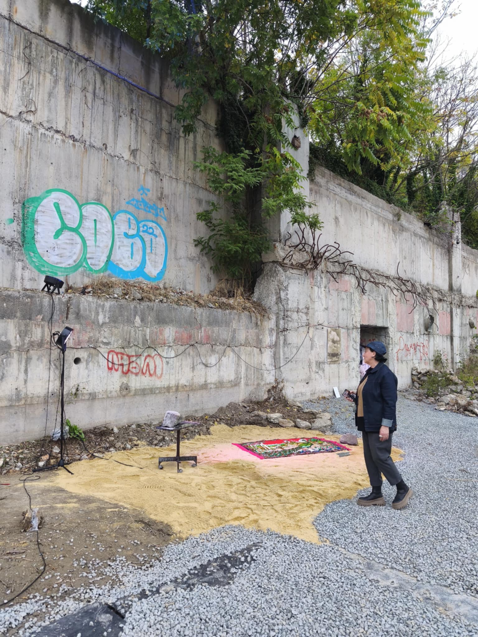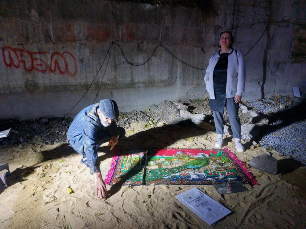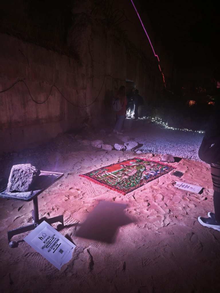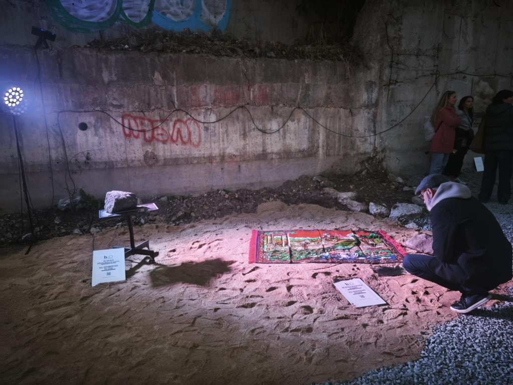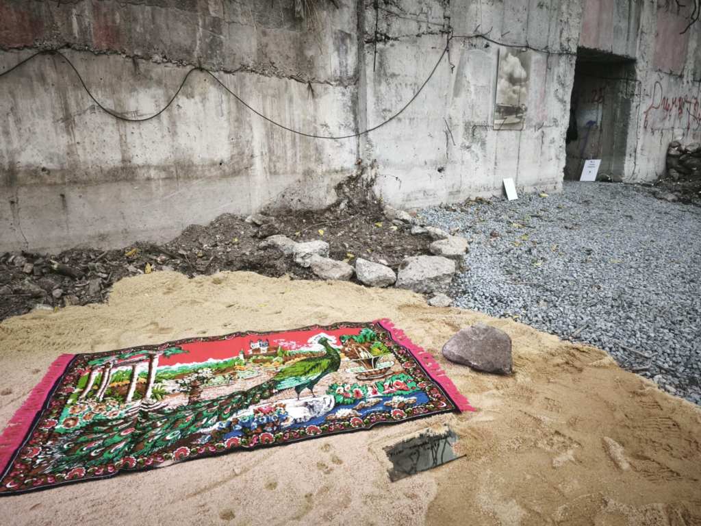 творбата включва ковьор от края на 20 век, изобразяващ паун в градина с фонтан и арка – в преобладаващо ярки цветове / камък_естествена скална маса / парче огледало с надпис_колко струва камъкът ти, Сизифе?