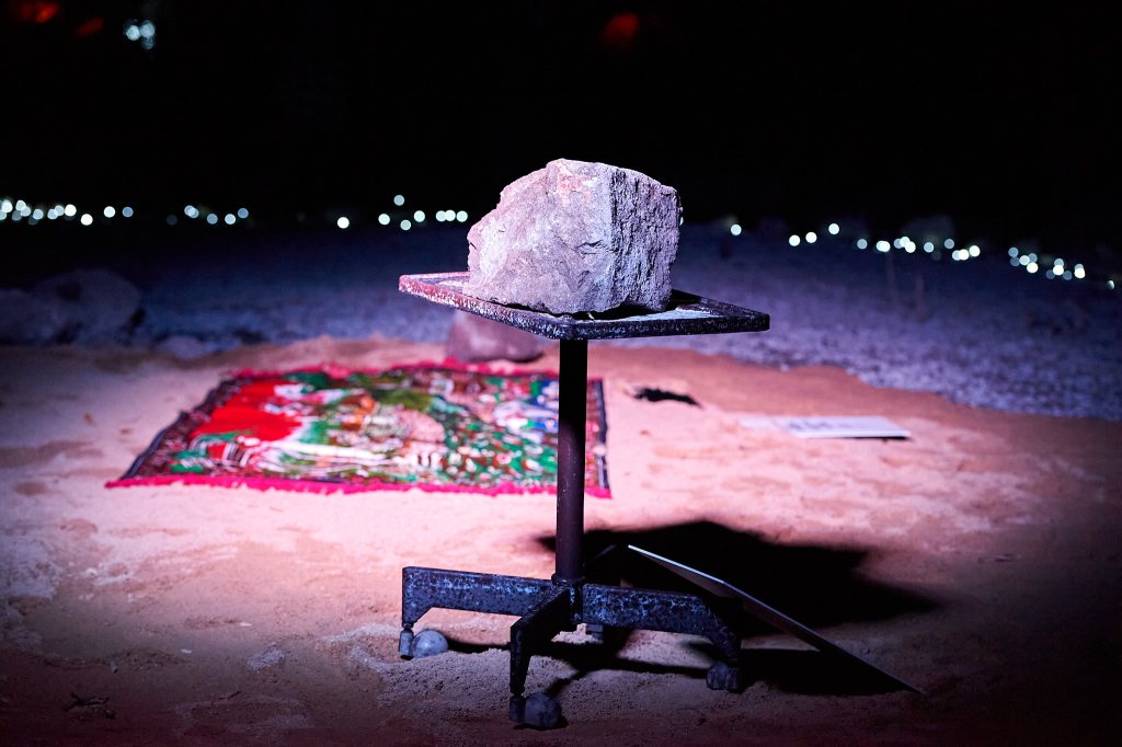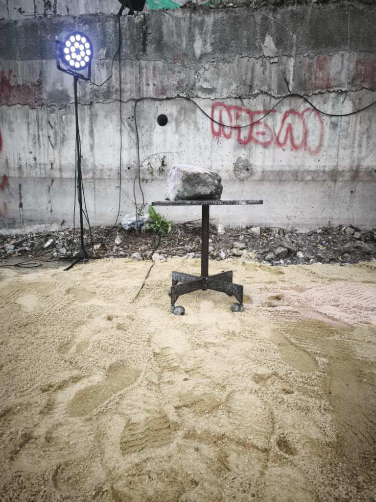 камък върху въртяща се маса за телевизор / въртенето се извършва във всички посоки, а придвижването й – чрез въртящи се колела_ за да кореспондира с голямата тема – съмнението /