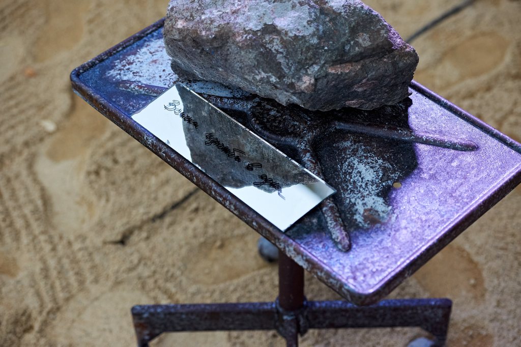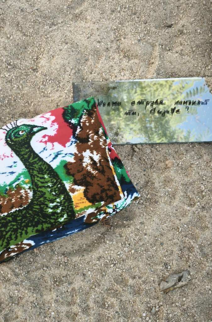 върху парчета огледална повърхност с видими следи от ръждива вода поставих надписите, за да живеят като визуални метафори_ четящият среща себе си / чрез отразеността в огледалото / в конструкцията от думи и въпроси_