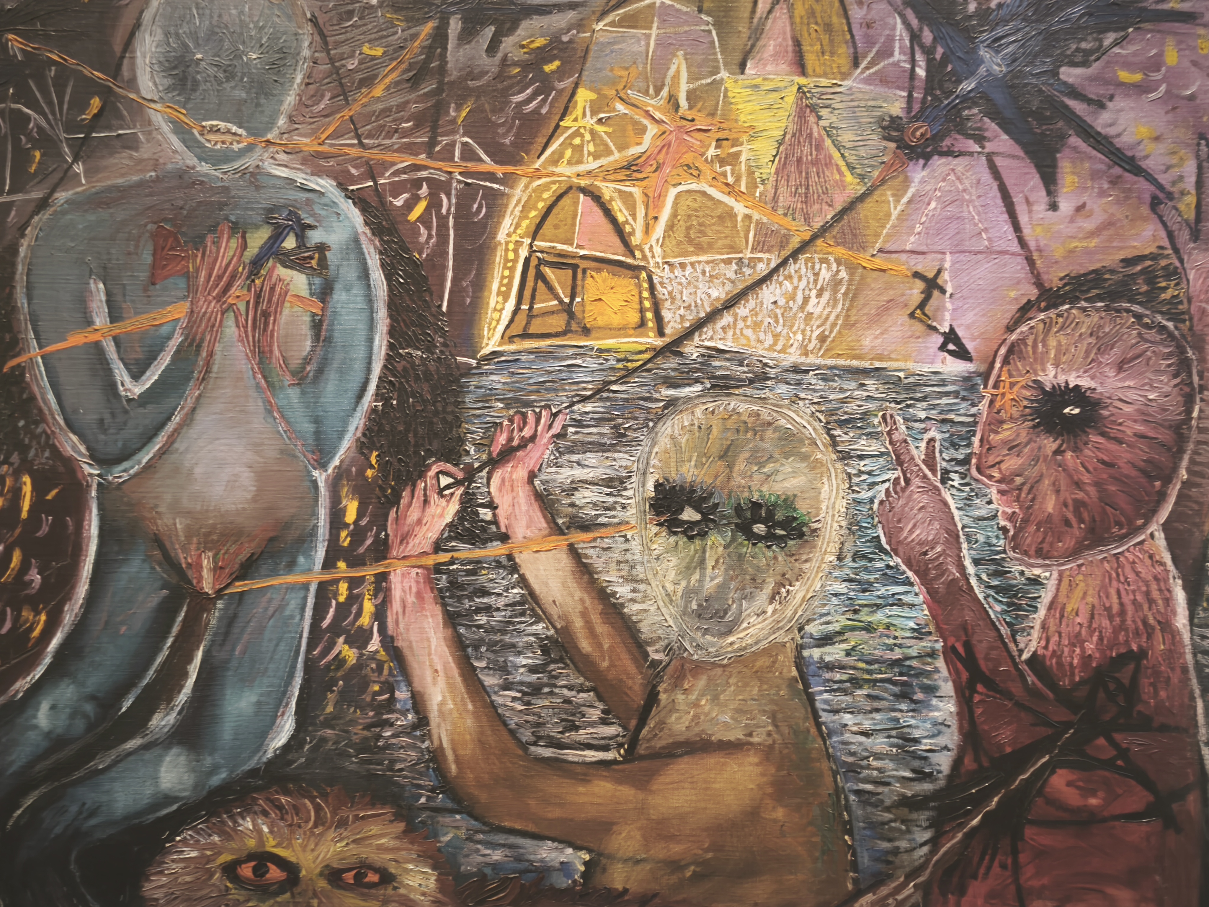 при цялостния поглед в пространството, съчетало модернистичния дух на вглеждане и потъване във формите, и бягащите като в танц цветове, неминуемо се замислям за какво говори съзидателната енергия, ако не я разглеждаме като повод за среща със света / ние в него / малките му ежедневни революции със значението на промени, говорещи с езика на еволюиращото мисловно поле. но в същото време и опасността – наред с всяка прогресивност, застава и истината за недотам добрата й употреба или артикулация.