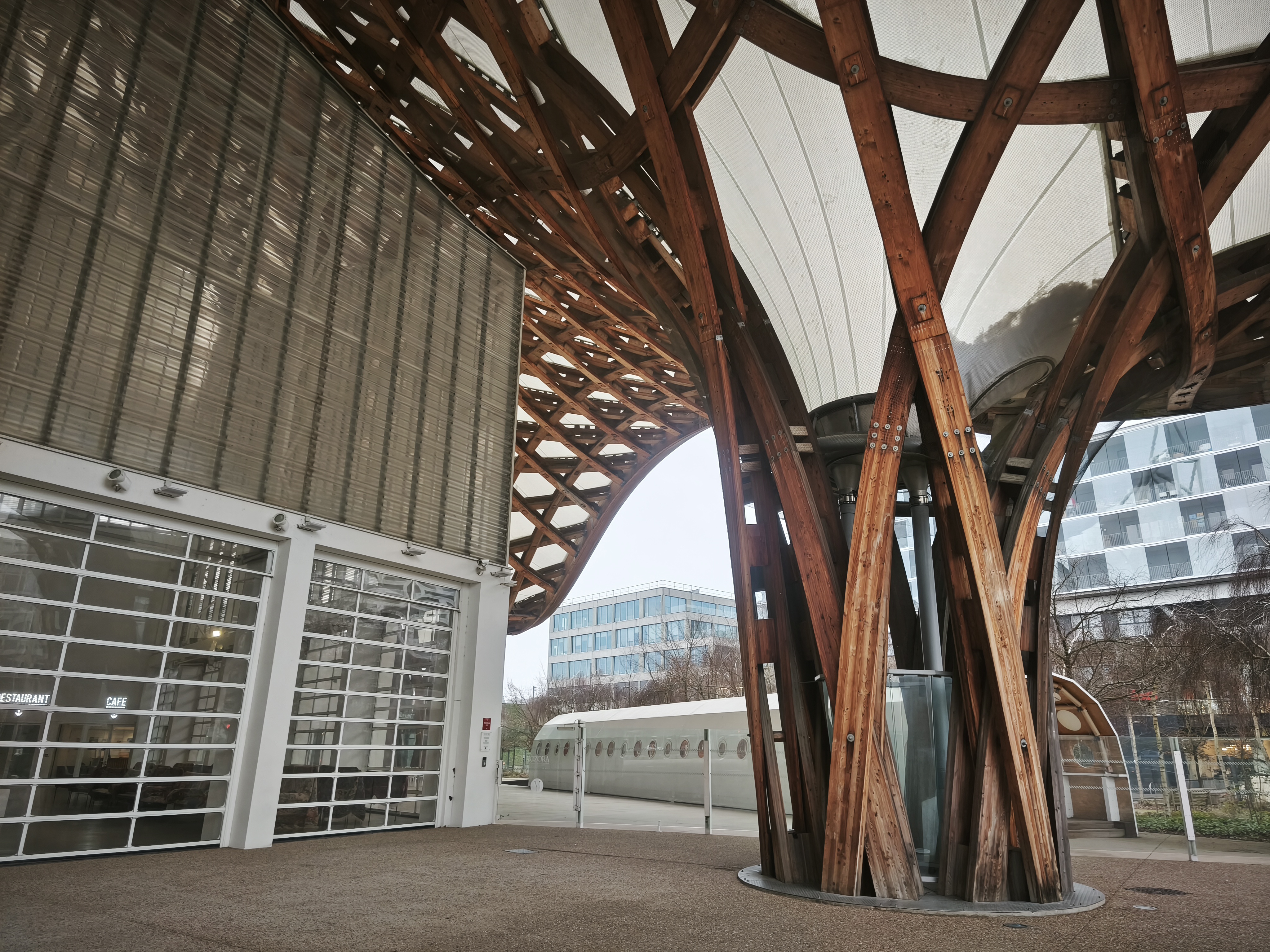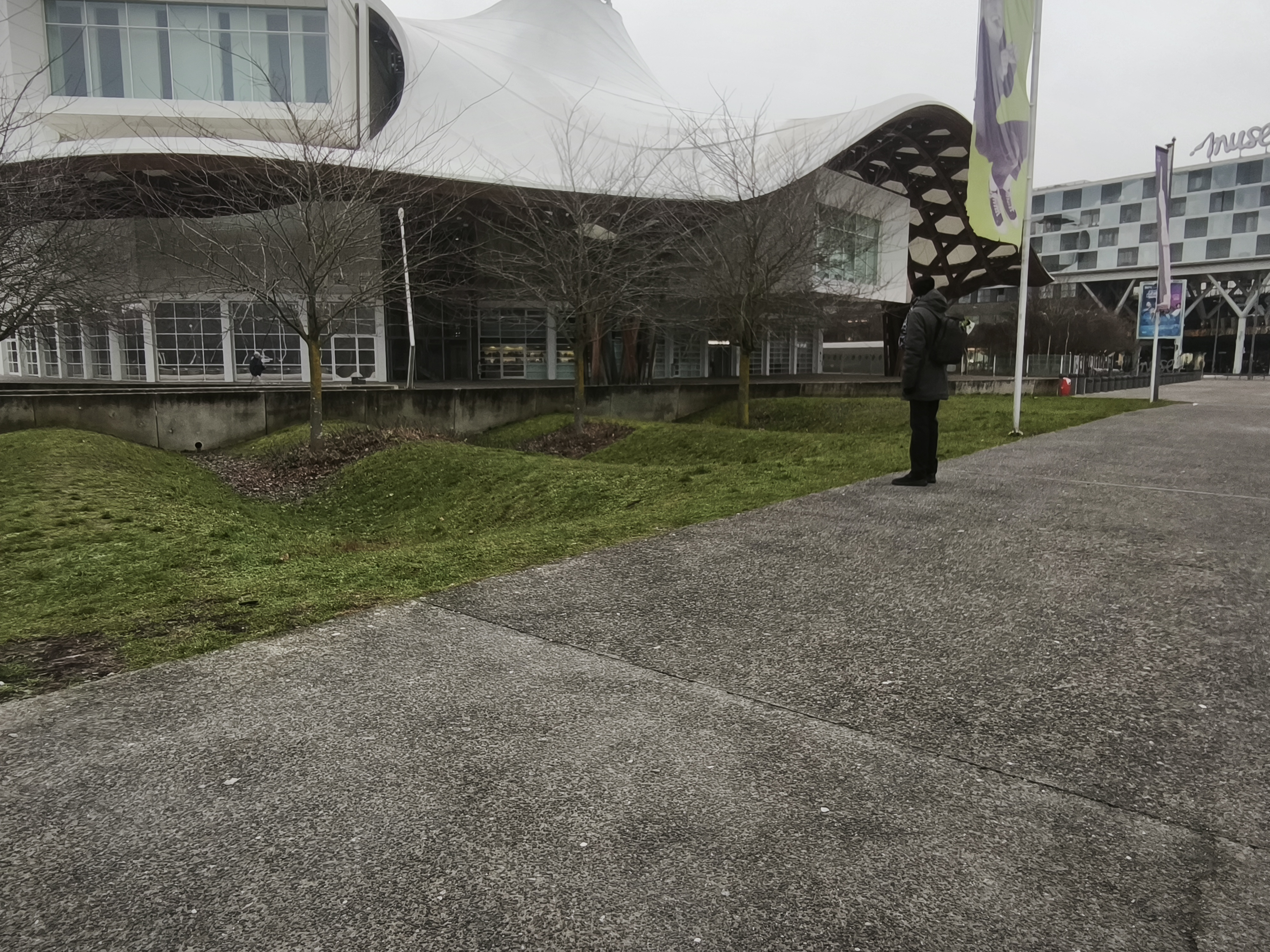 и парковите пространства наоколо следват усещането за вълна, превърнала се във важен архитектурен код за сградата_