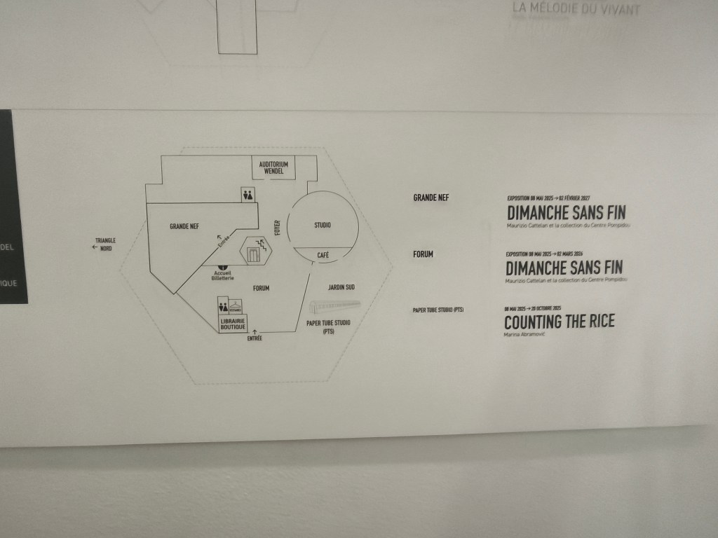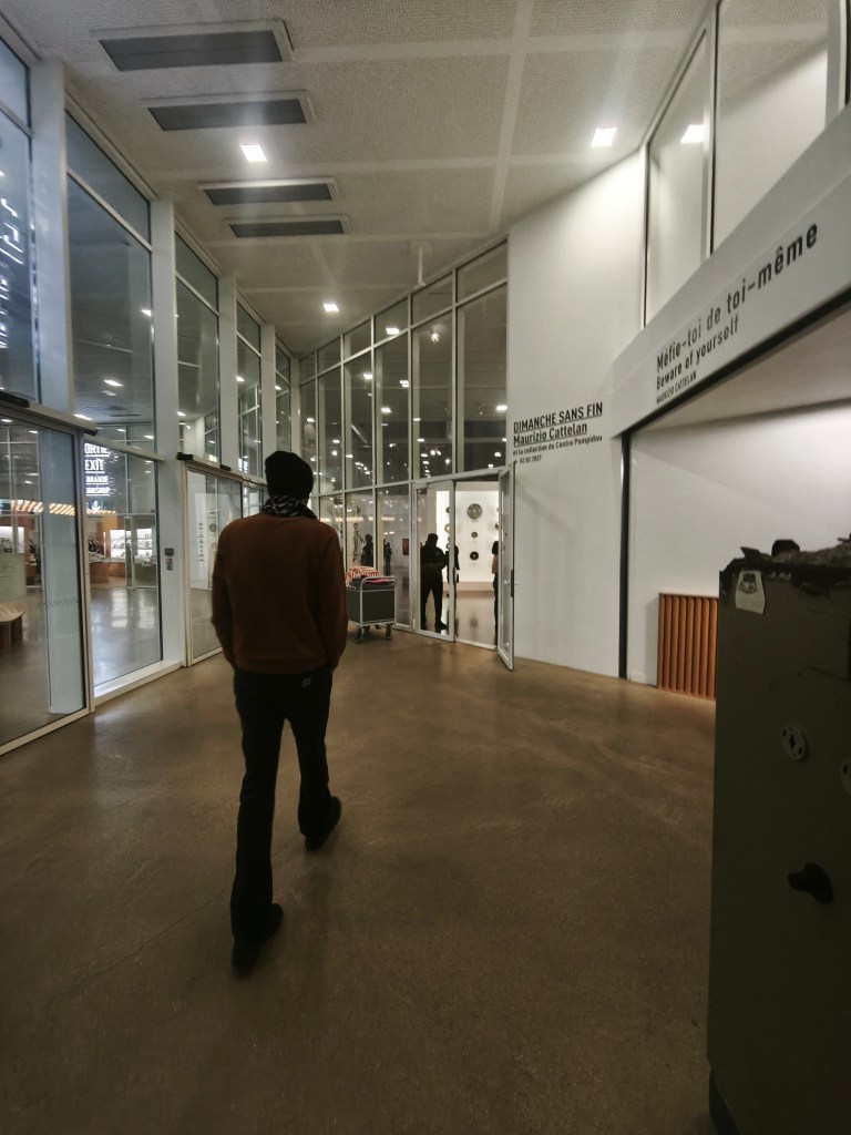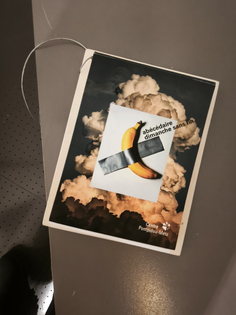 повод да пътуваме до Мец, в който ще останем и да нощуваме, за да усетим как заспива и как се буди един френски град, бил до 1918 година изцяло немски, е именно изложбата ‘ БЕЗКРАЙНАТА НЕДЕЛЯ ‘, която освен кураторски проект на Маурицио Кателан е и визионерска платформа за показване на знакови негови творби, съчетани с тъканта на избрани музейни експонати_част от колекцията на Помпиду_Париж, като сградата там ще остане в ремонт за близките 5 години.