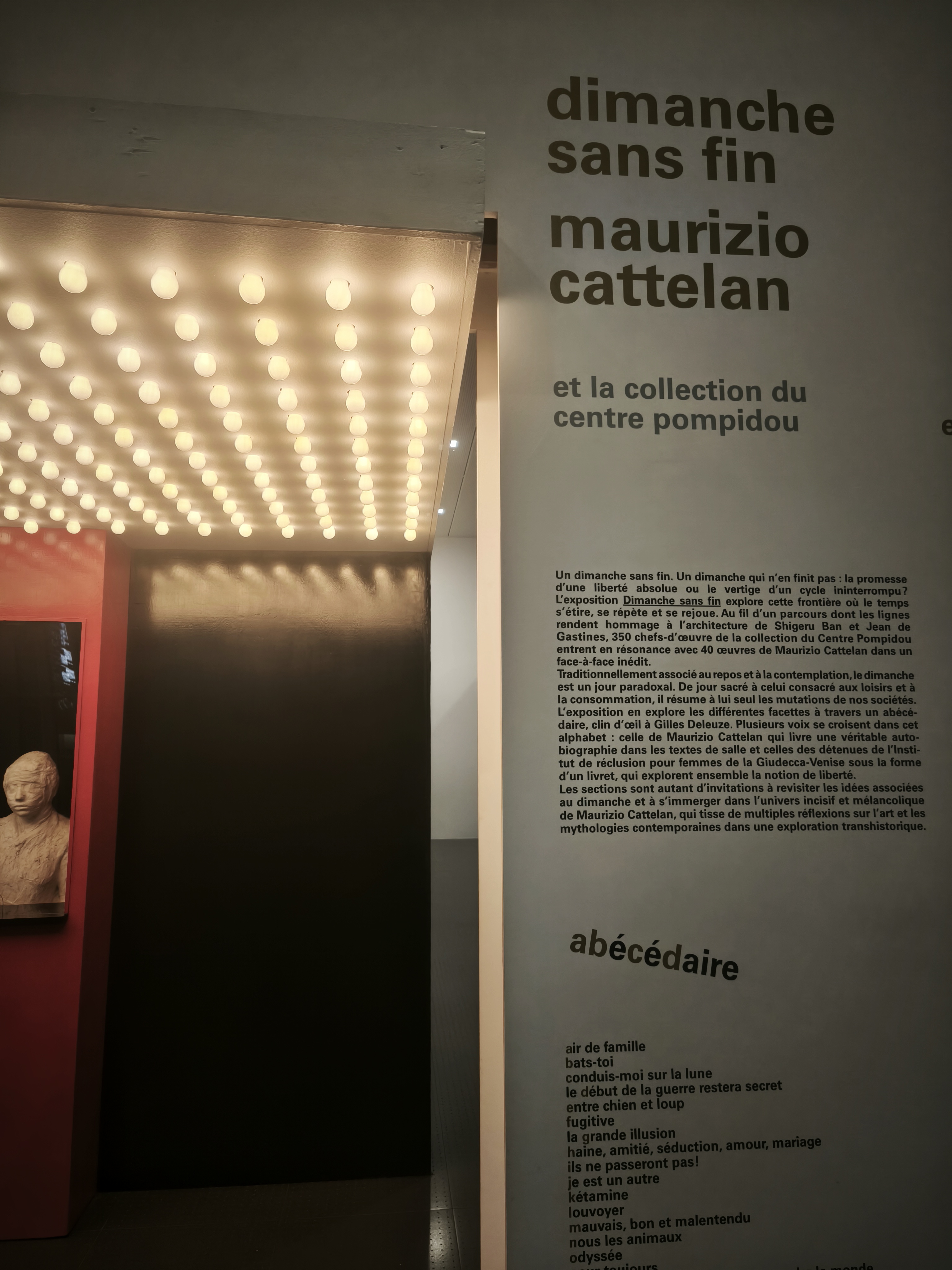 озаглавена ‘ Безкрайна неделя ‘, изложбата представя в общ план стотици произведения от колекцията на Център Жорж Помпиду в Париж_такива, които са рядко излагани и произведения, чието присъствие в експозицията човек не би очаквал_ / показвайки разнообразните художествени практики, движения и промени в историята на изкуството /, в диалог с лични произведения на Маурицио Кателан.