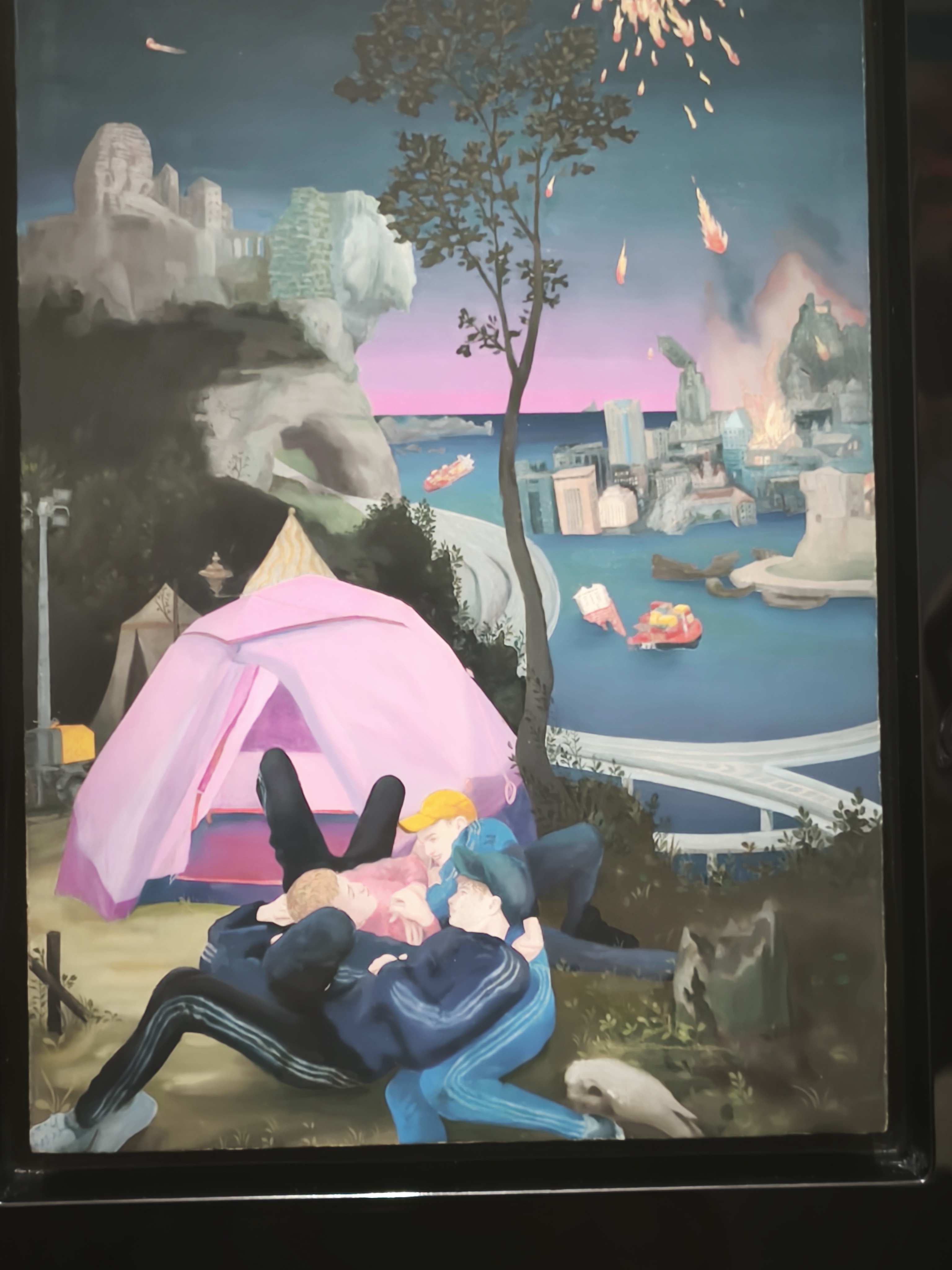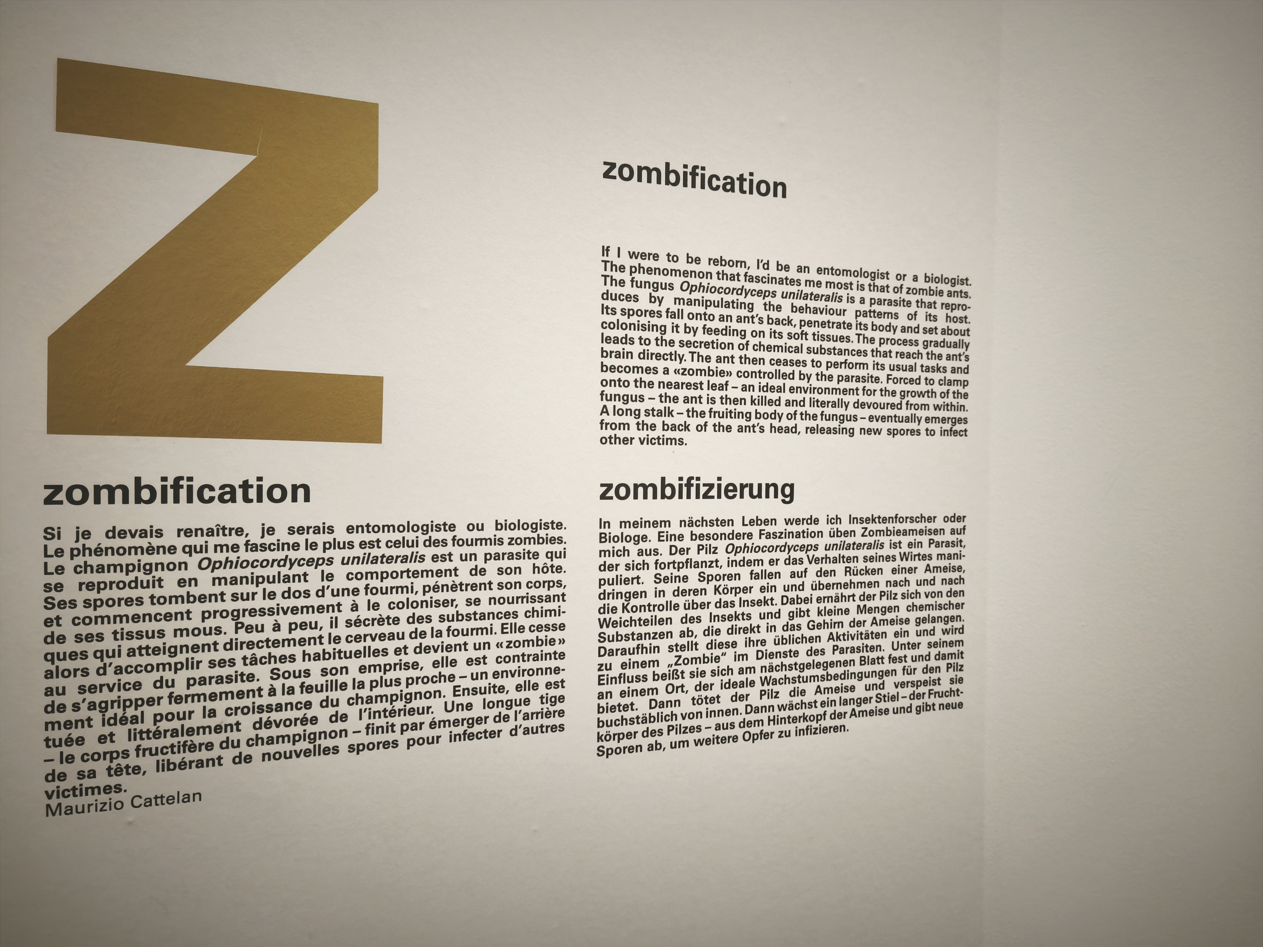връзката между експонатите от колекцията на Жорж Помпиду в Париж, сега разположени в Мец, тяхната времево – пространствена устойчивост в съзвучие с концептуалния почерк и специфичен прочит през автентичния език на творбите на Маурицио Кателан, тяханта необяснима и необхватна свързаност.