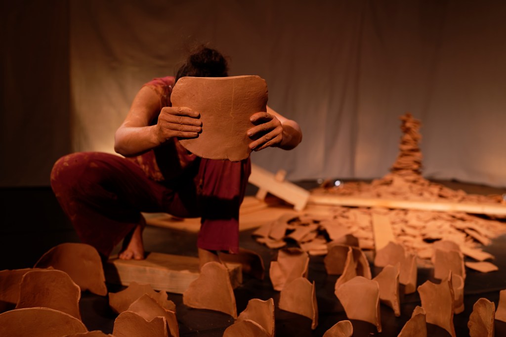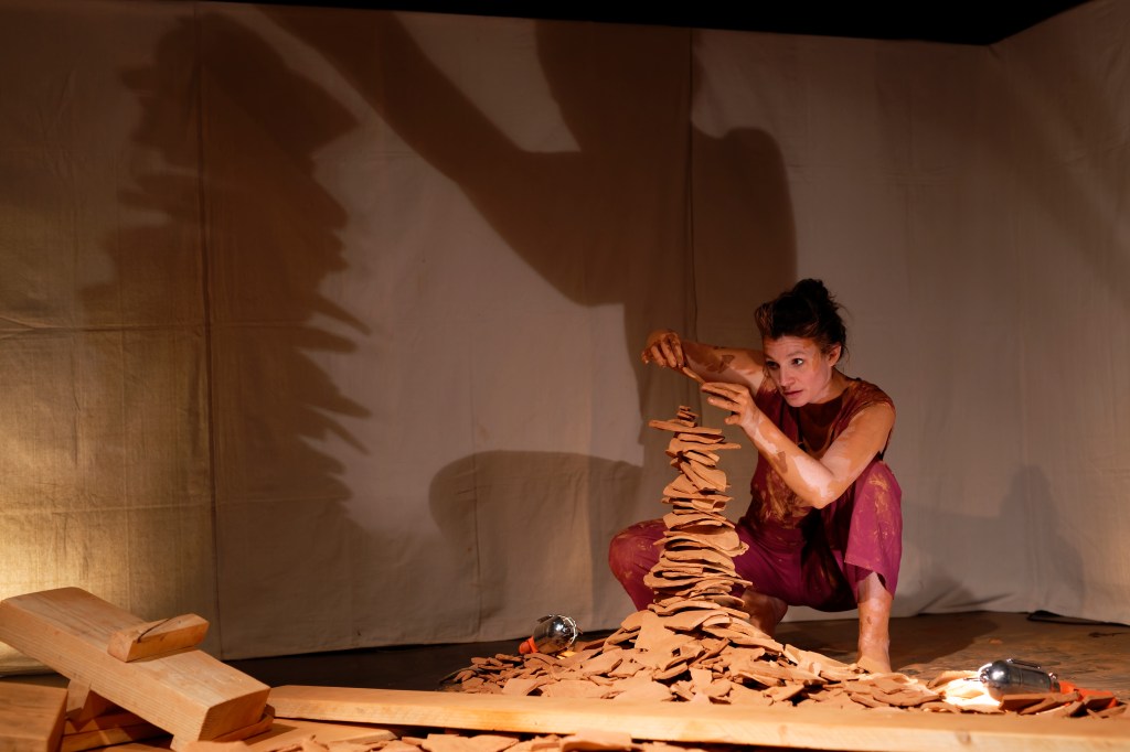 да, земният живот има свое минало, но копнежът е роден от крилете на порива, новостта, движението за мига и неговата философия, частиците му [сега]_ в неуловимото. затова Карин приканва децата_малки и големи да споделят онова, което изпитва тя_духа на материята_като същинска майка, от която се раждаме всички. заедно с това, приобщаването на зрителите в театралния акт / артистката подава глинени парчета на зрителите, които отнасят със себе си, с други пък заедно изграждат дом / спектакълът разшива и разкроява рамките на очакваността, внушавайки идеята за общото ни глобално тяло. и подобно на път, всяко начало започва с пътуване в себе си.
