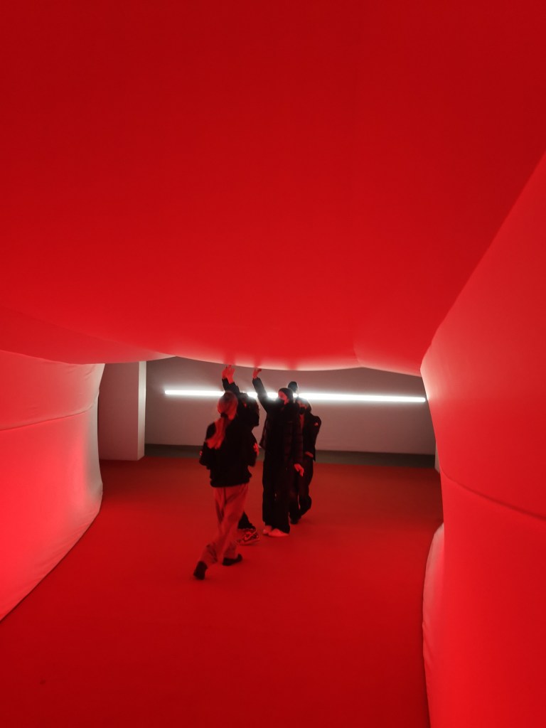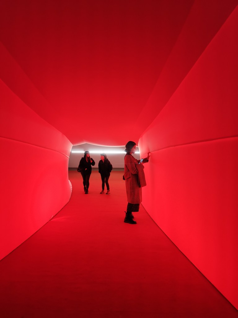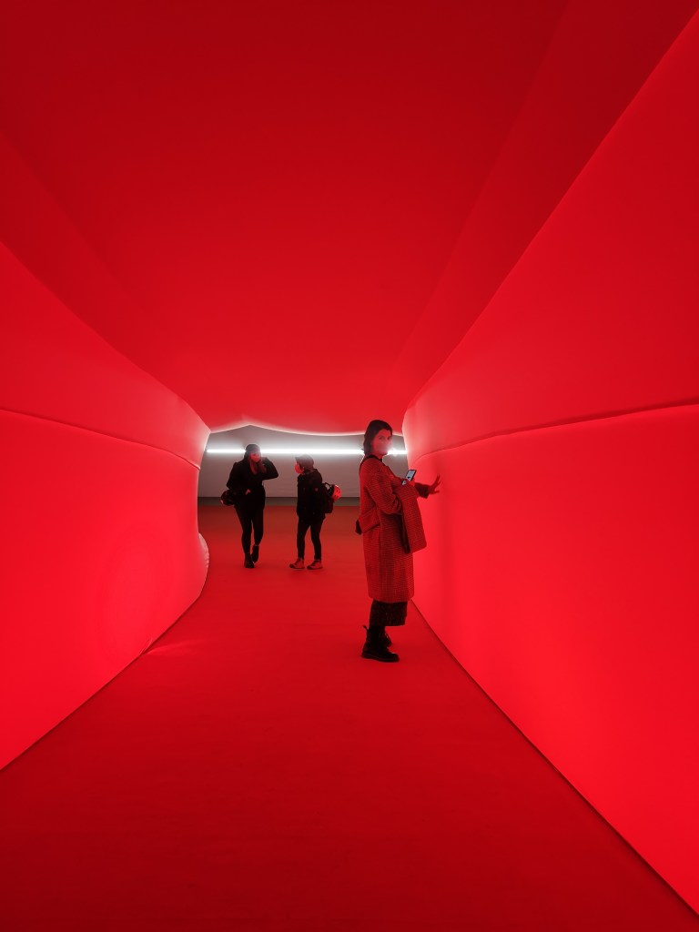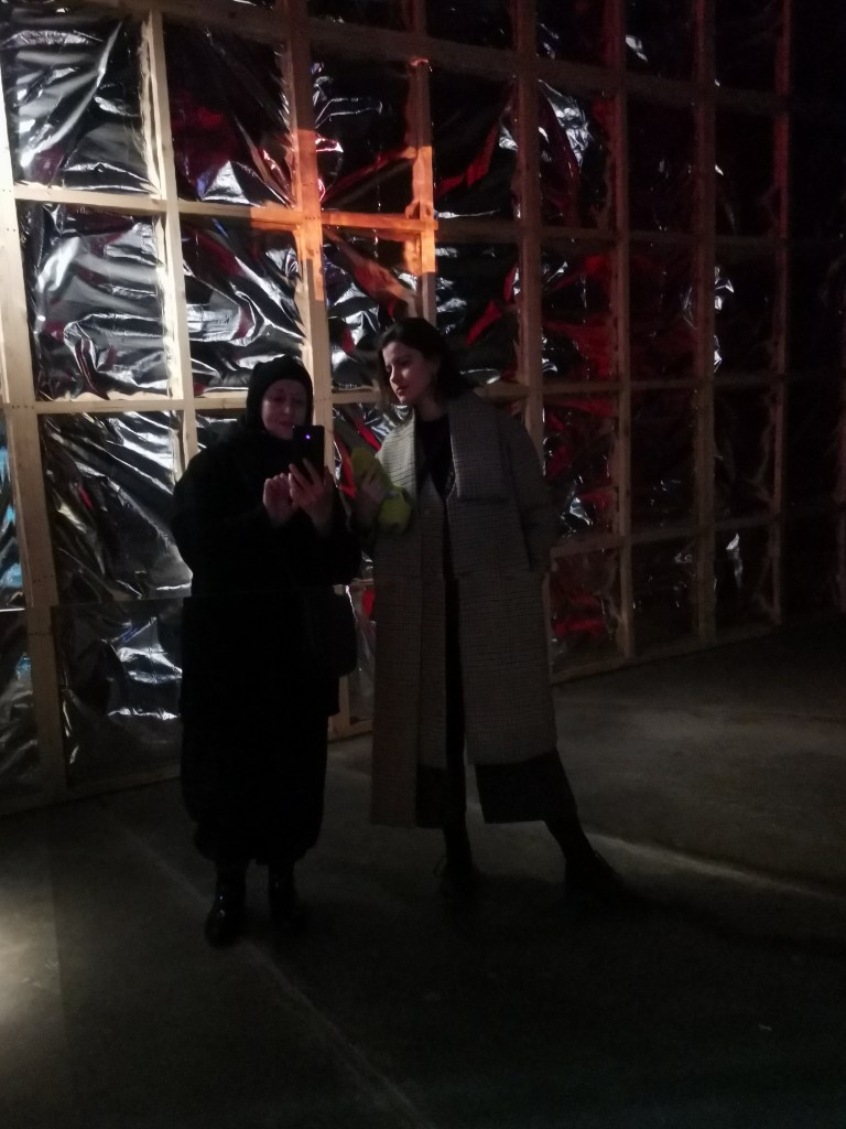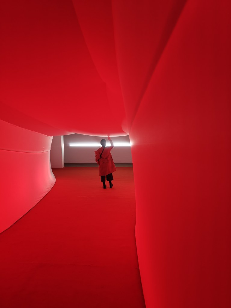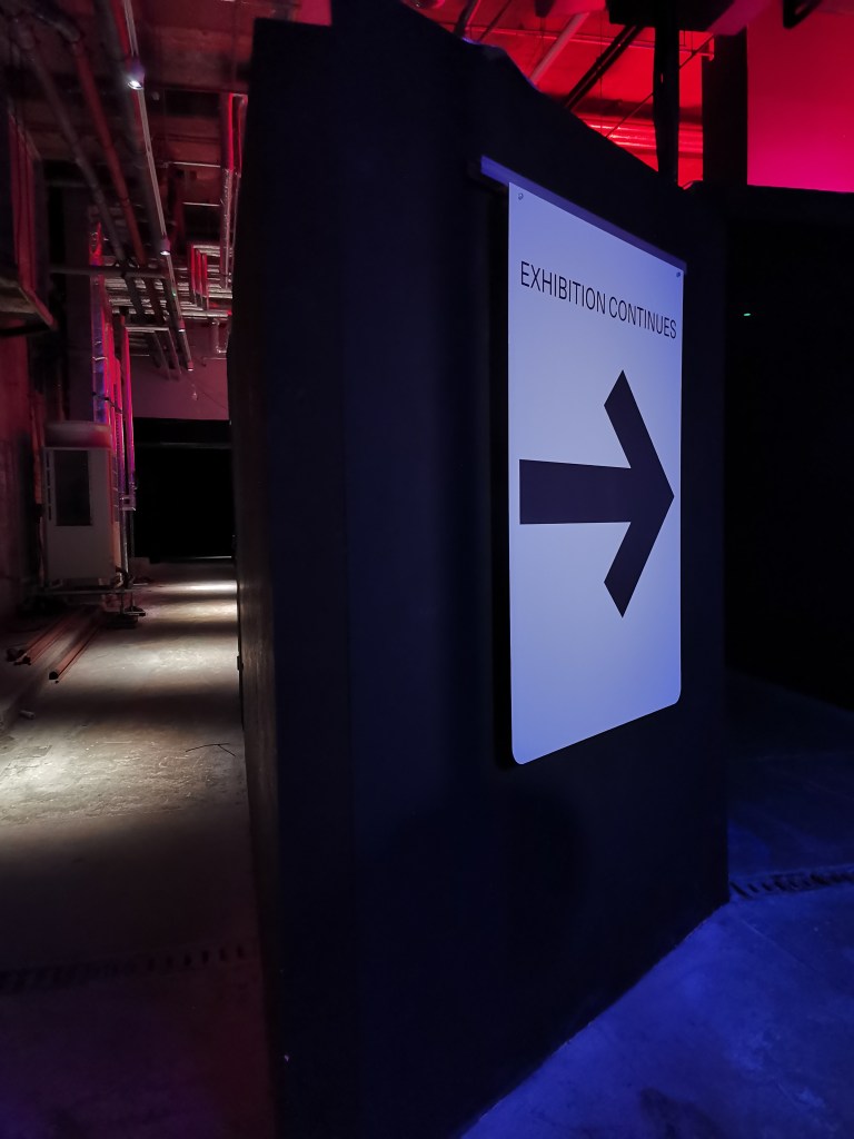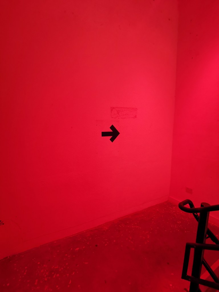 изземва функциите на движението като преместване в права линия, за да разиграе и въвлече в нова схема всичко познато_до неузнаваемост_от стрелките при входа, червените завеси и неонови реплики по стените на подземия, лабиринти и тунели, до момента, в който учтиво ни настигна сътрудник, упътващ движението на зрителите, с въпроса – ‘ разбрах, че търсите морето. ами то е просто горе! ‘ / ставаше въпрос за залата с вълната_творба на колектива a’strict_знаейки, че не бива да я пропускаме в процеса, а докато попивахме и дискутирахме в дълги интервали всяка идея, заедно с чувството за свечеряване, дойде и притеснението, че е възможно да остане невидяна … самото придвижване в това пространство, инспириращата атмосфера, хипнотичното въздействие, оставят вкус на ‘ нещо ‘ от Дейвид Линч и още от самото начало_чувството за нова сензитивна клапа, стартираща с първата стрелка, остана будно по време на пълното завъртане.