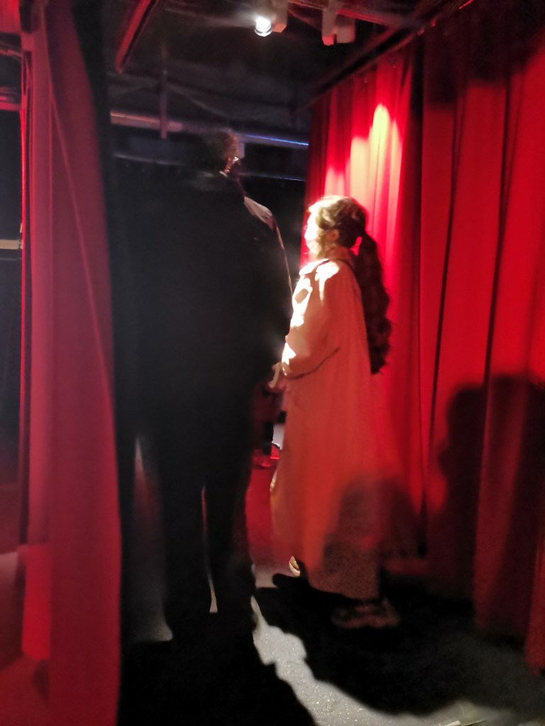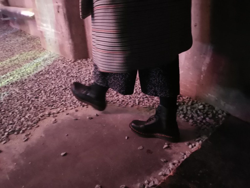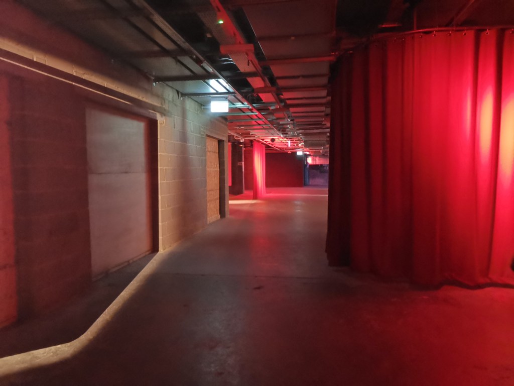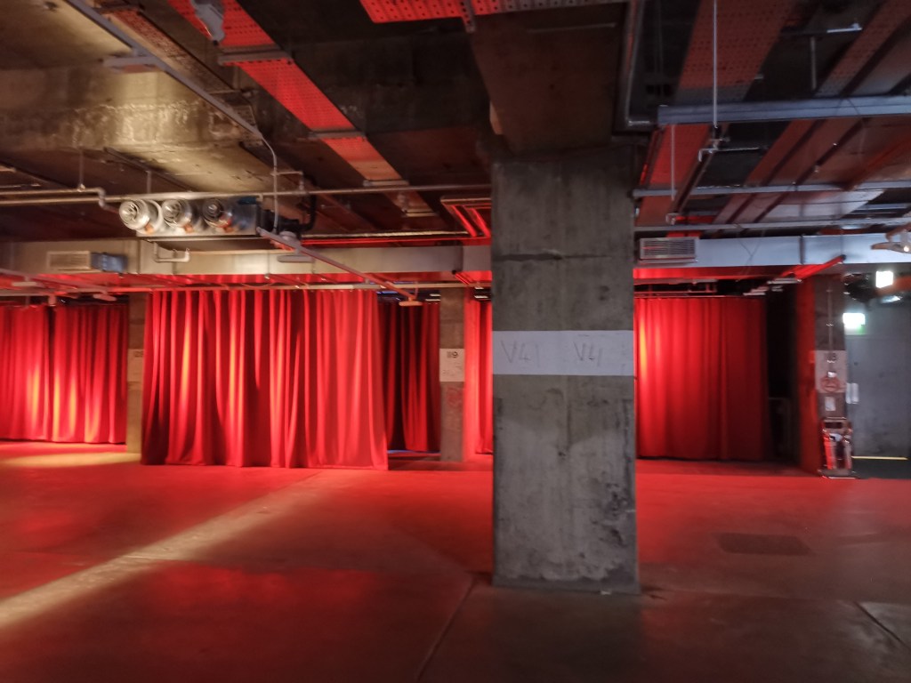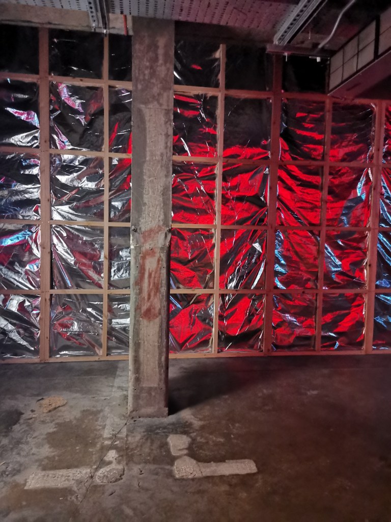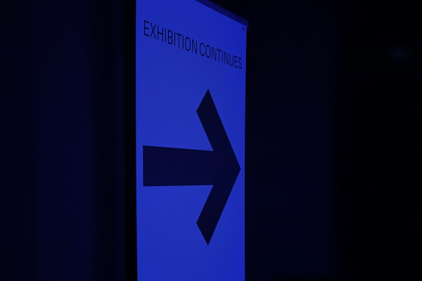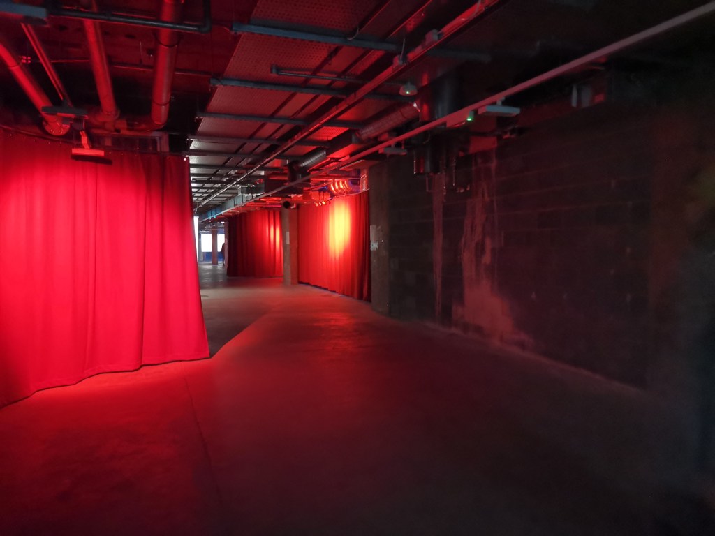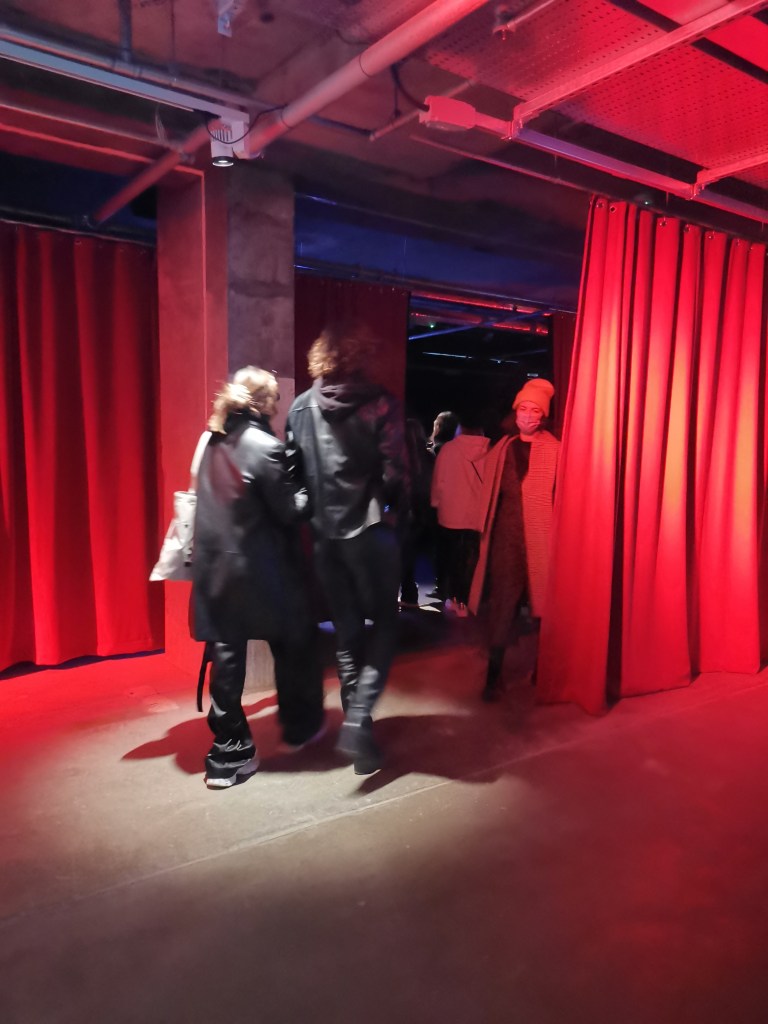изземва функциите на движението като преместване в права линия, за да разиграе и въвлече в нова схема всичко познато_до неузнаваемост_от стрелките при входа, червените завеси и неонови реплики по стените на подземия, лабиринти и тунели, до момента, в който учтиво ни настигна сътрудник, упътващ движението на зрителите, с въпроса – ‘ разбрах, че търсите морето. ами то е просто горе! ‘ / ставаше въпрос за залата с вълната_творба на колектива a’strict_знаейки, че не бива да я пропускаме в процеса, а докато попивахме и дискутирахме в дълги интервали всяка идея, заедно с чувството за свечеряване, дойде и притеснението, че е възможно да остане невидяна … самото придвижване в това пространство, инспириращата атмосфера, хипнотичното въздействие, оставят вкус на ‘ нещо ‘ от Дейвид Линч и още от самото начало_чувството за нова сензитивна клапа, стартираща с първата стрелка, остана будно по време на пълното завъртане.
