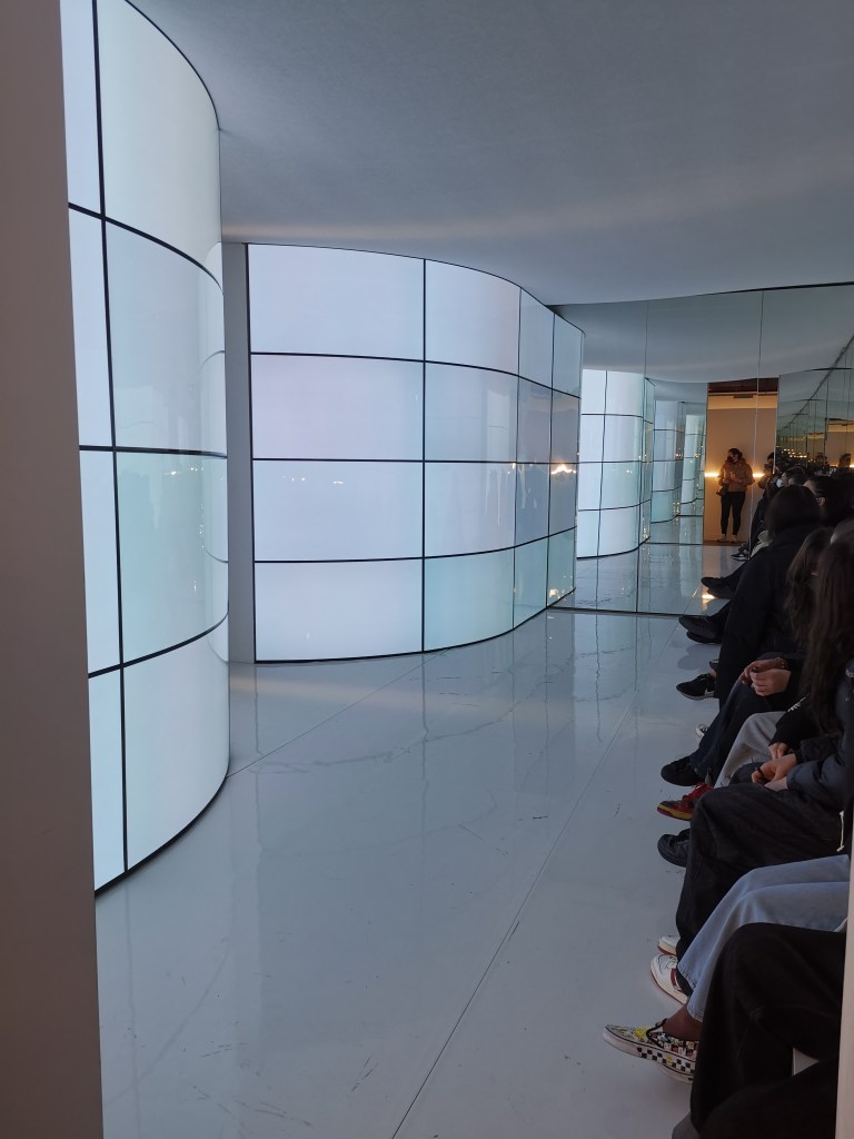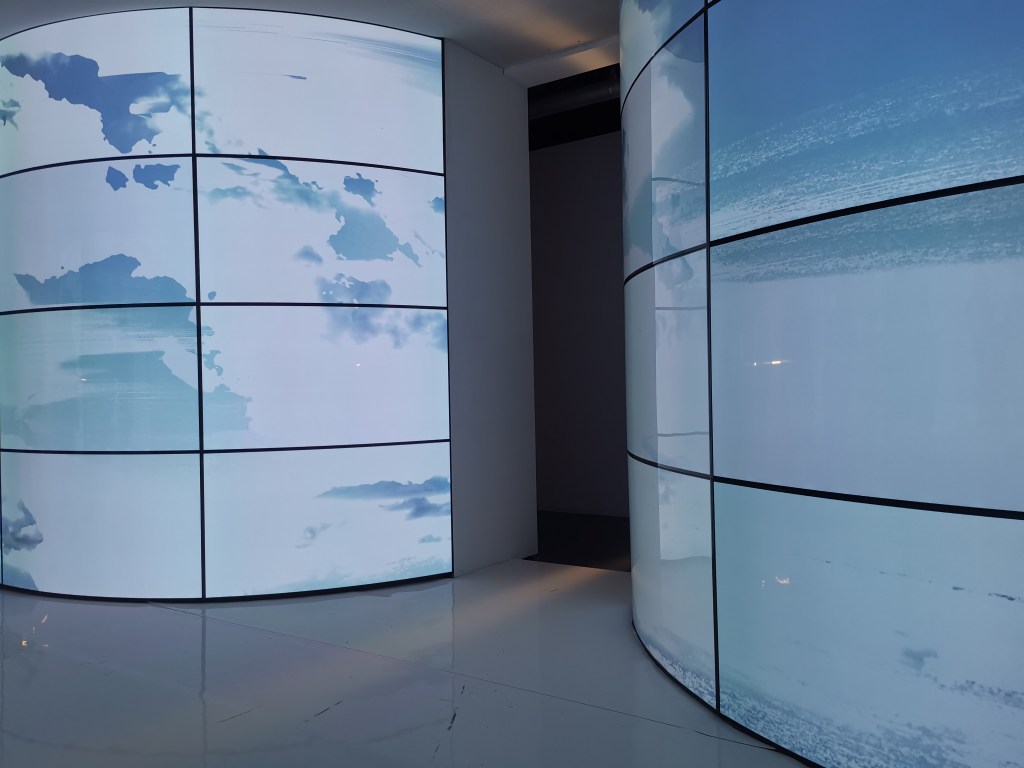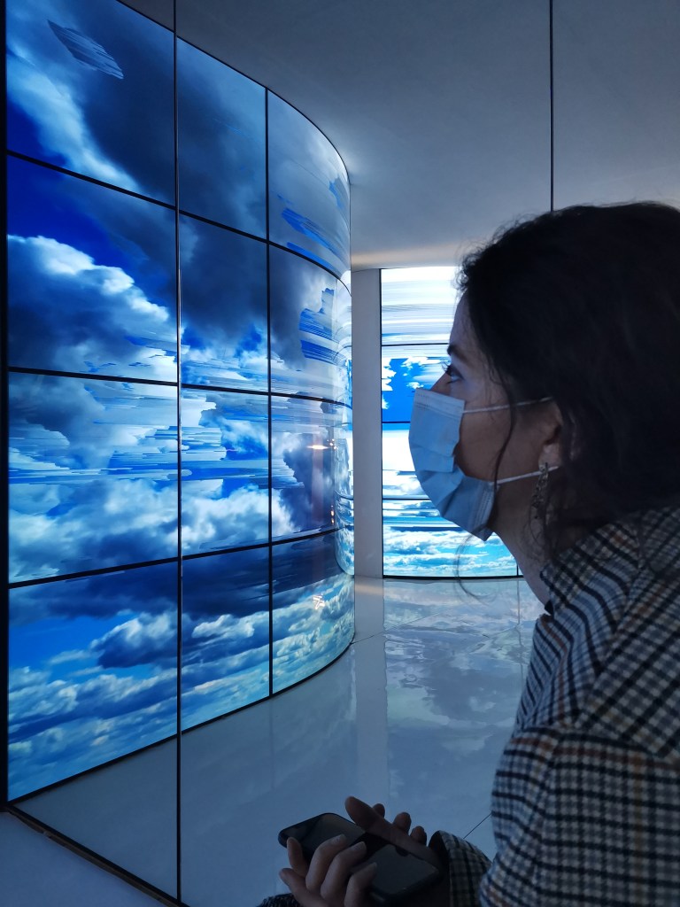 2_мащабни светещи панели, които модулират прехода за зрителите, като визуализират изчезването на синьото небе / претопяването му в равно бяло поле_резултат от гео-инженерната дейност, която предизвиква глобално земно затопляне.