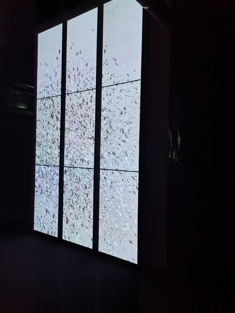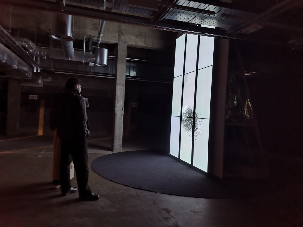 многоканалната видео инсталация на арт колективa Random International представя новата работа Algorithmic Swarm Study / Triptych, като изследва движението на групата, инстинктите и стадното поведение, което не допуска отклонение от цялото.
